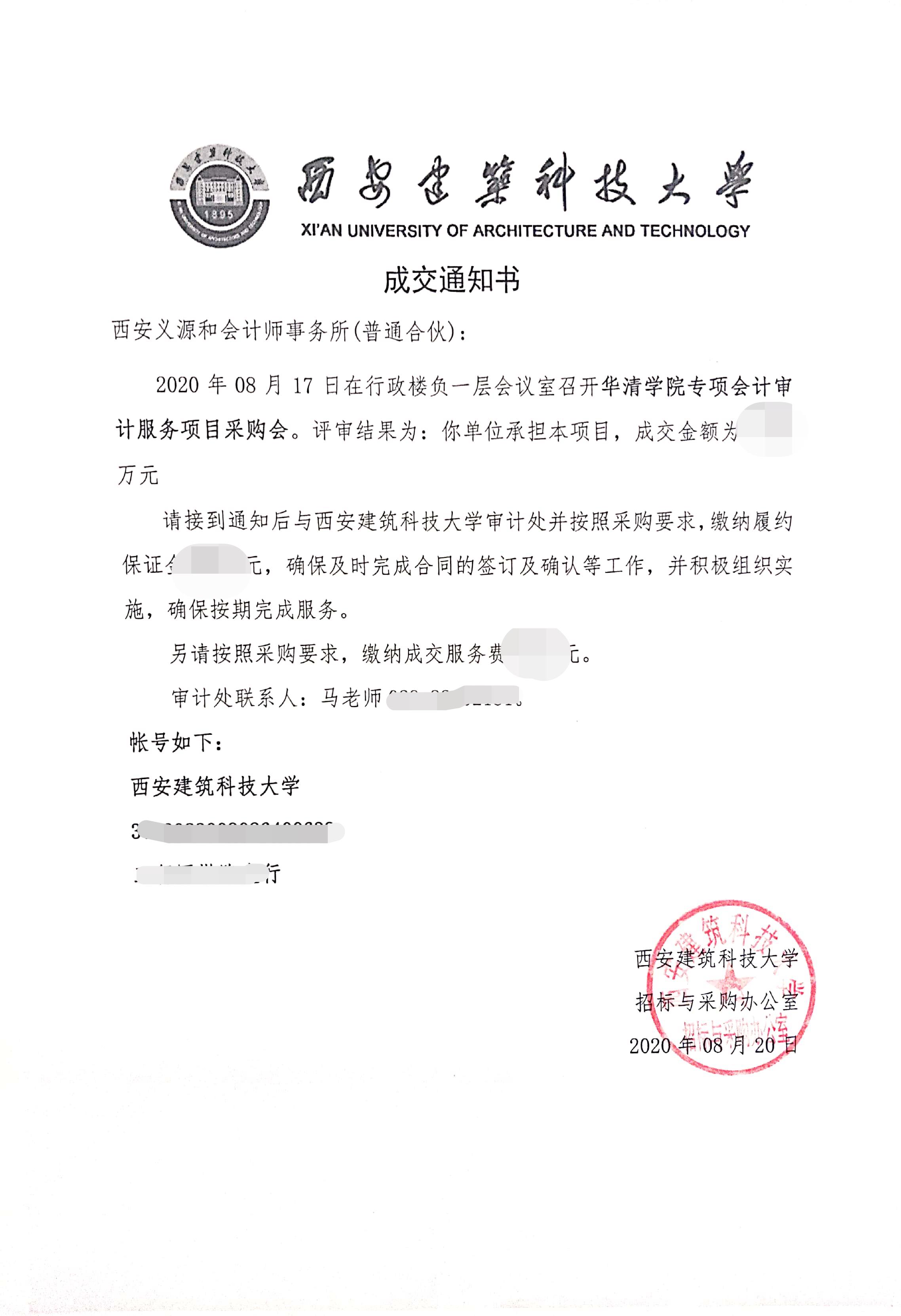 2020年8月20日,我所中标西安建筑科技大学华清学院专项会计审计服务项目!